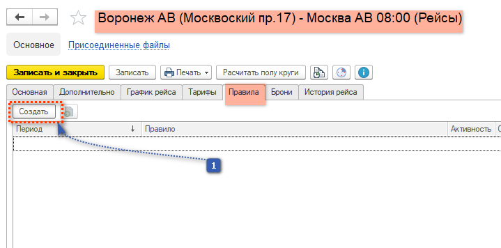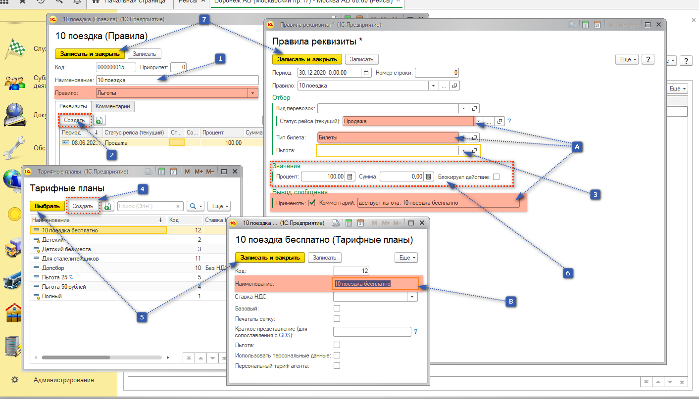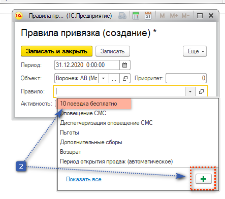 1. В поле Правило выбираем правило "Льготы", обязательно меняем наименование на "10 Поездка".