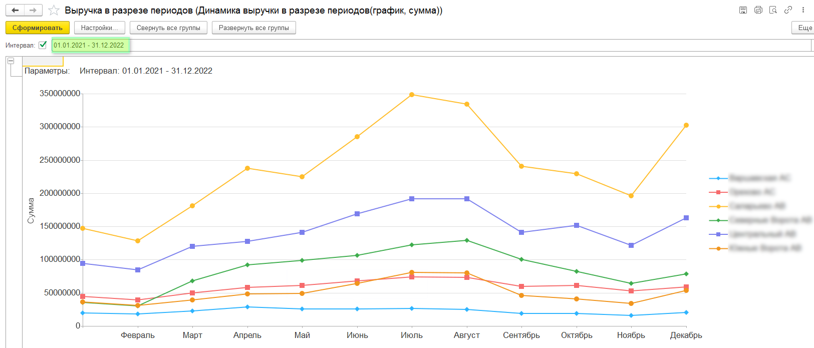 Текущий раздел представляет собой группу отчетов и позволяет получить сводные сведения по различным периодам. Данные могут бы представлены как в табличной форме, так и в диаграммах. Достаточно выбрать необходимый отчет, указать период и нажать кнопку Сформировать.