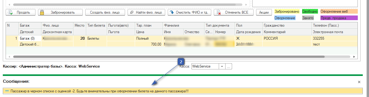 Находим в списке нужного пассажира и открываем его двойным кликом. В поле оценка пишем оценку при которой будет невозможна продажа билета пассажиру.