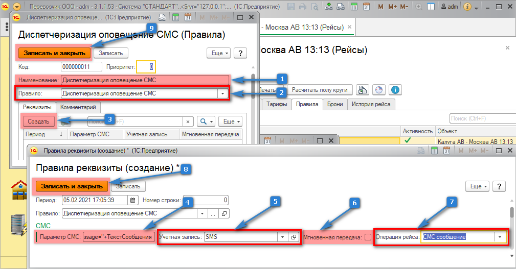 1. Прописываем наименование правила "Диспетчеризация оповещение СМС" - правило позволяет отправлять сообщения в диспетчеризации всем пассажирам, которые купили билет на рейс общей рассылкой.