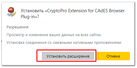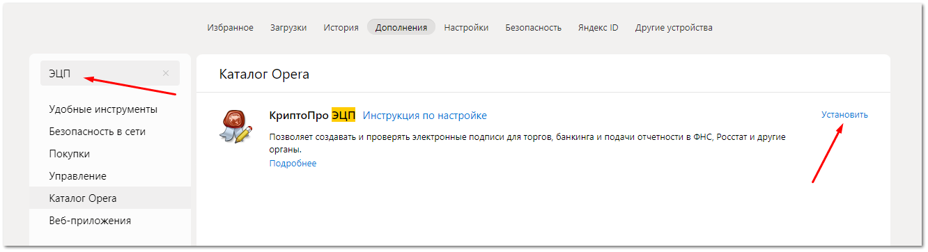 Наберите в строке поиска "ЭЦП". В области поиска появится возможность установить расширение. Нажмите Установить.