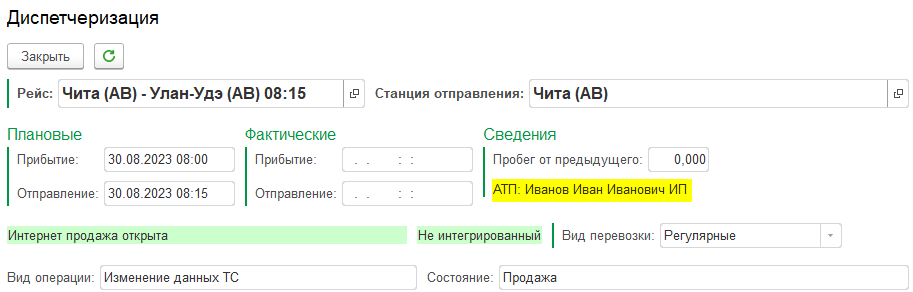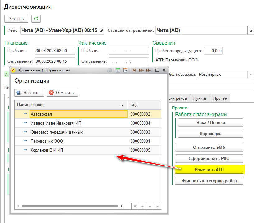 Чтобы изменить перевозчика до отправки рейса нажмите кнопку Изменить АТП.