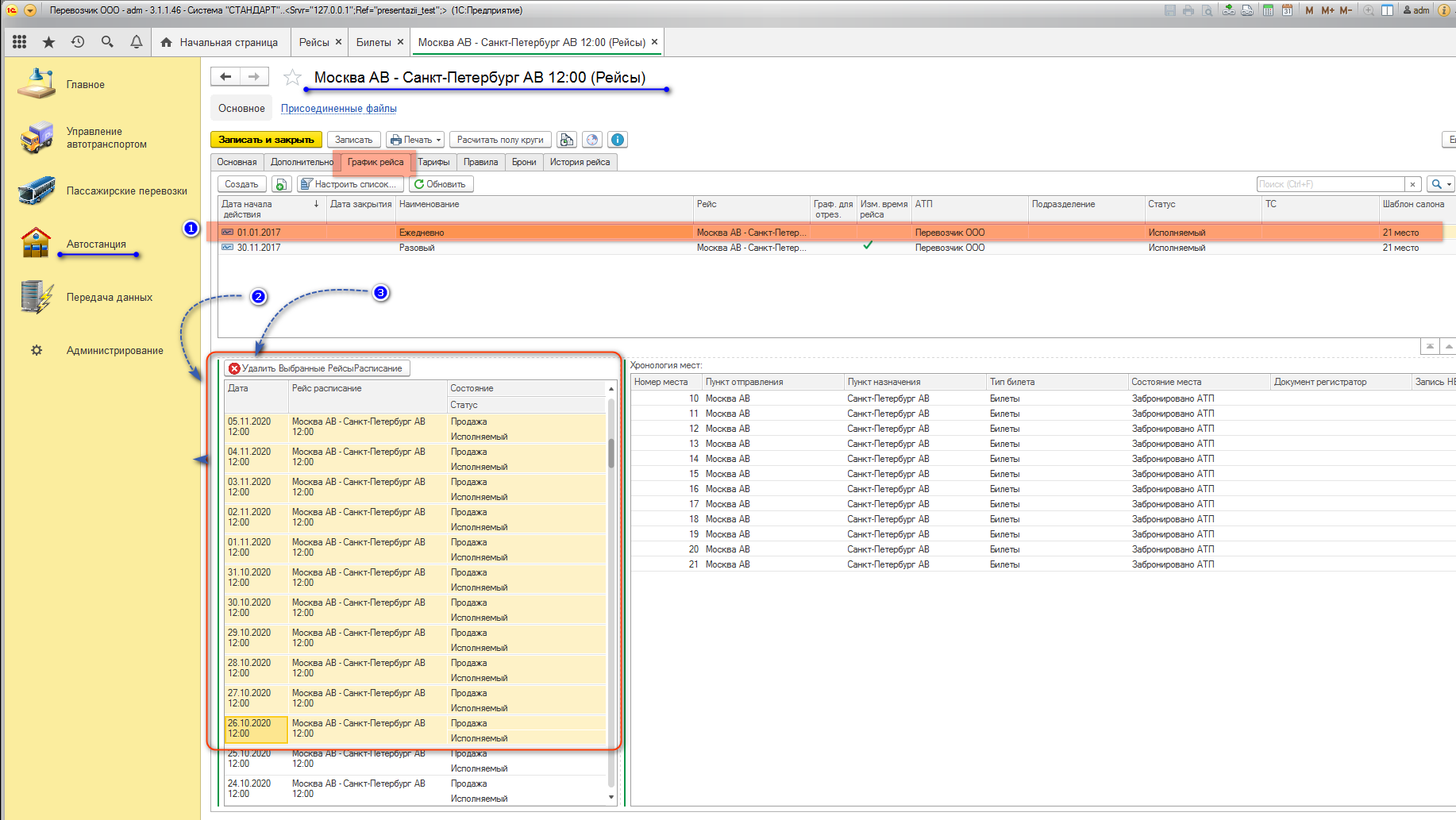 ВАЖНО: расписания не удаляются, если были на этот день проданы билеты, сделаны бронирования или другие действия с местами.