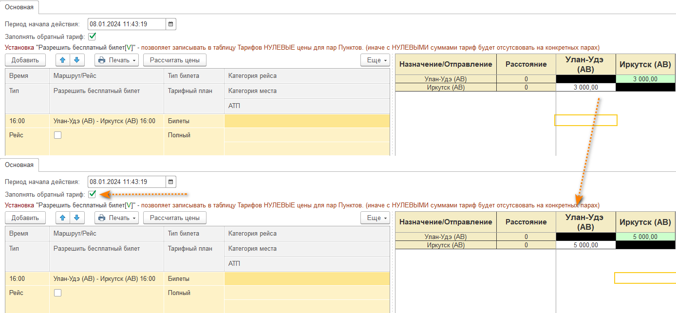 Если проставлена галочка "Заполнять обратный тариф" можно заполнить стоимость билета в одном направлении.