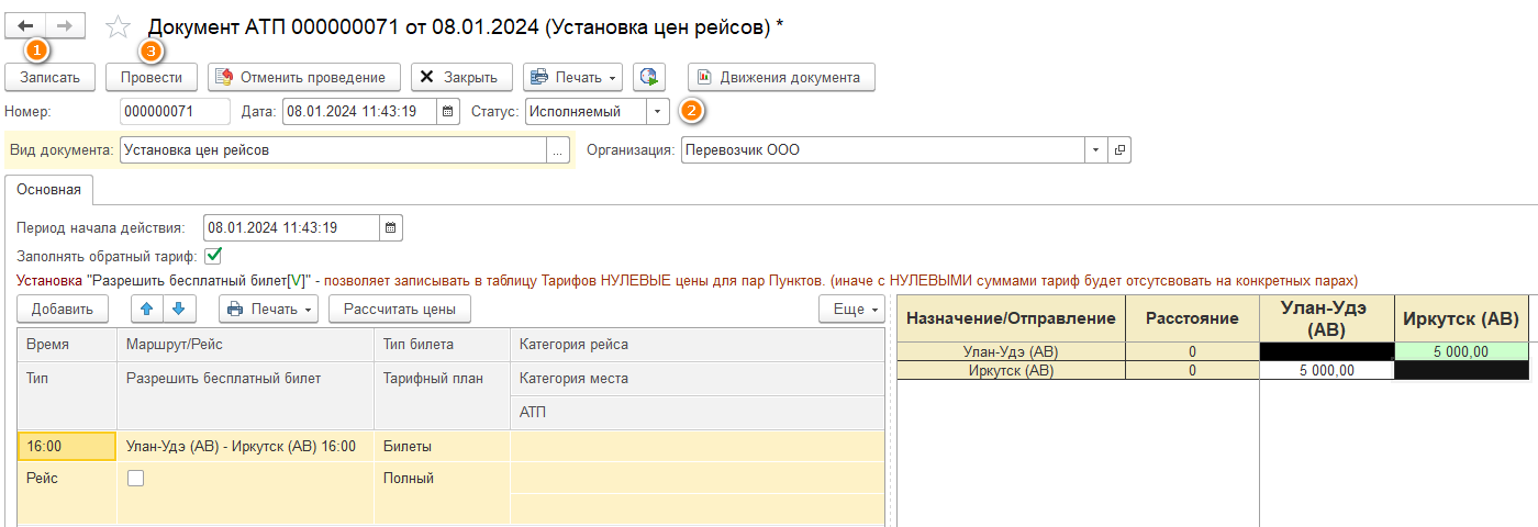 Меню Автостанция - Организация перевозок - Документы (АТП) - Установка цен рейсов