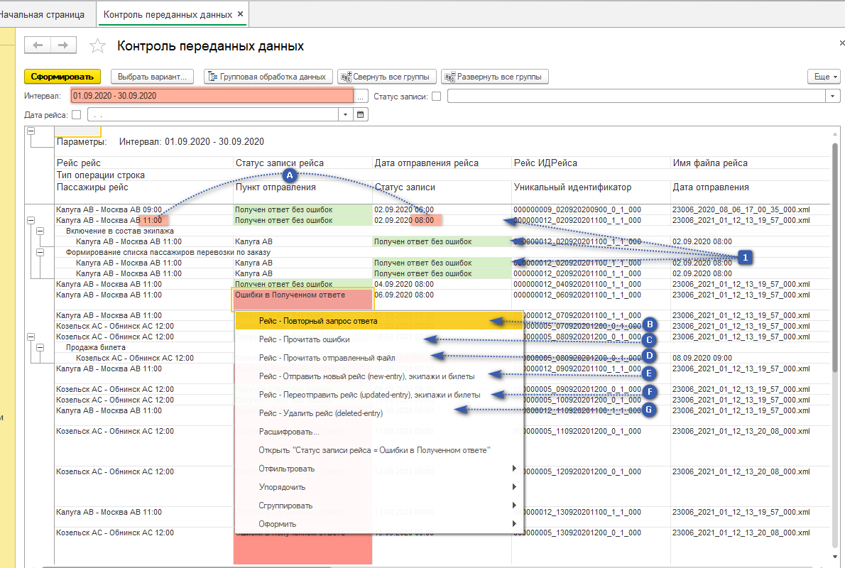 - Е - Отправить новый рейс - это произойдет повторная отправка сведений о рейсе, но с пометой в передаче как новый, актуальна такая передача на ошибку МинТранса "В БД нет записи или помечена как неактуальная"