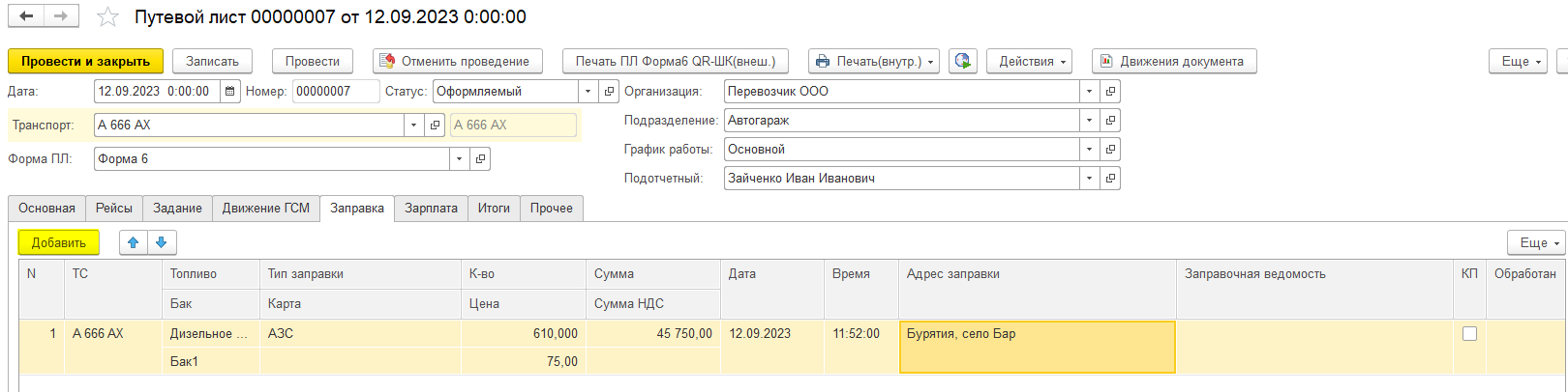 Сведения о заправках данного ТС заполняется на вкладке Заправка.