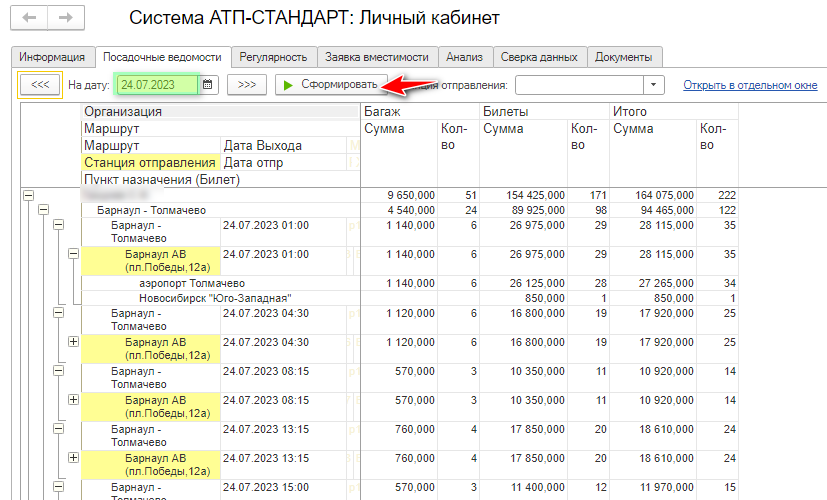 Также в этом отчёте отражается количество и сумма всех перевезенных пассажиров и багажа не зависимо от способа продажи билетов и их принадлежности ("свой"/ "чужой").