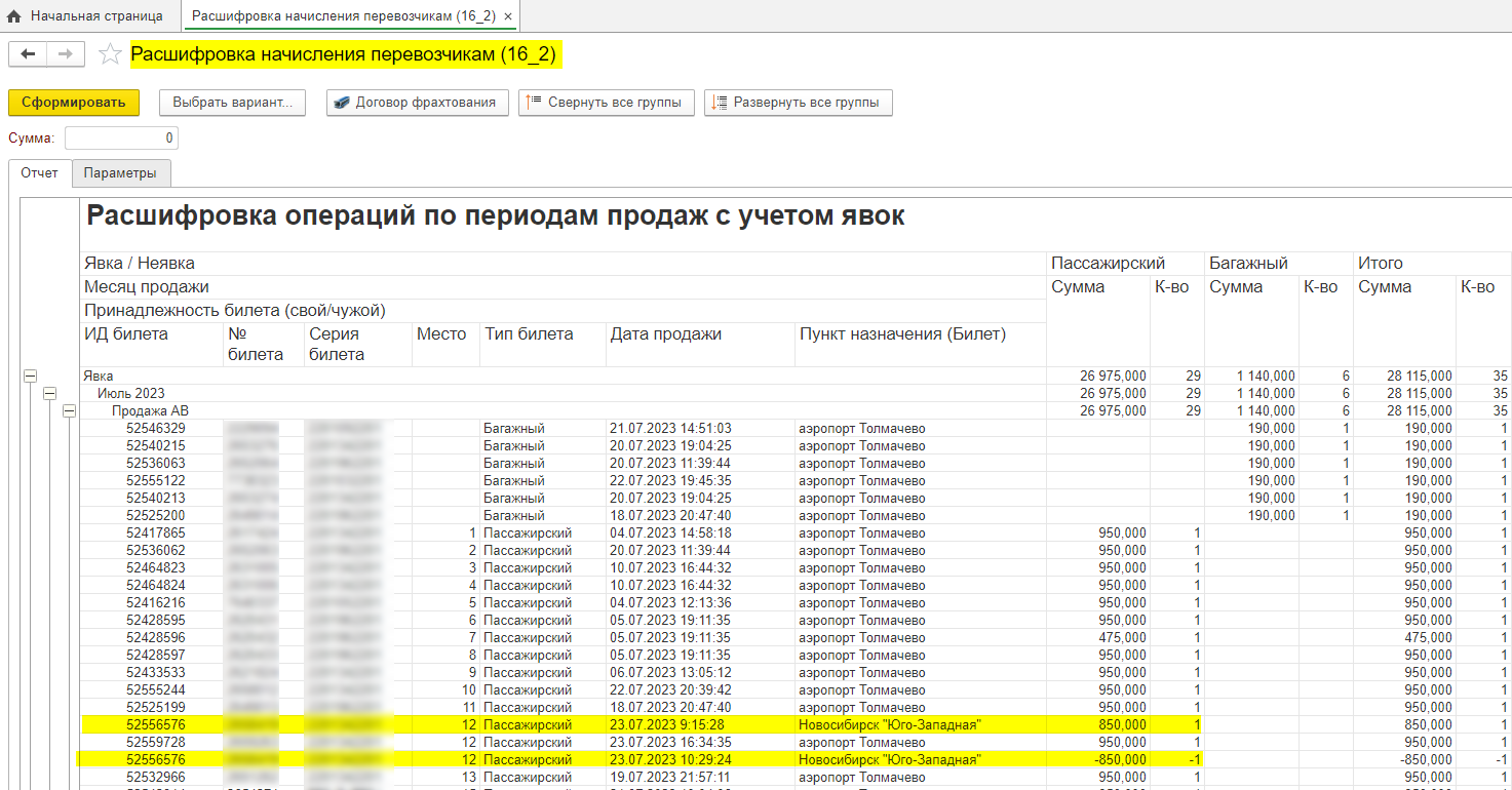 В данном отражены только те билеты по которым была зафиксирована Явка. Билеты с неявкой в отчете не отображаются.