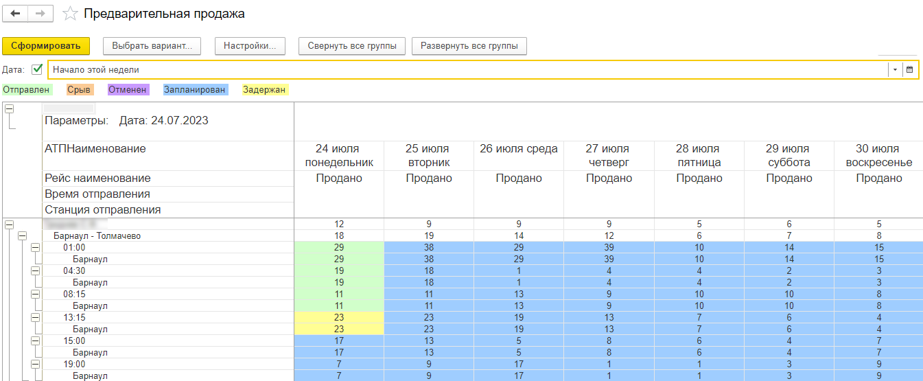 Выбираем период формирования отчета - Сформировать. В открывшемся отчете мы можем проследить, в каком статусе на конкретную дату находится рейс. В самой первой строке с наименованием рейса мы можем увидеть среднее кол-во проданных билетов на все рейсы.