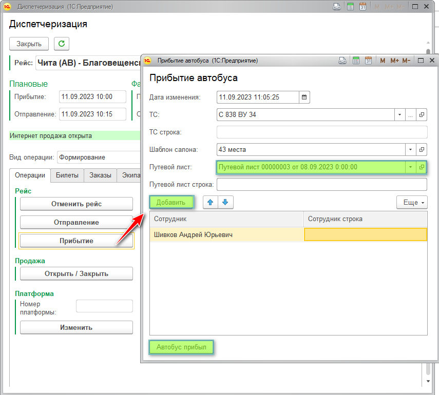 Прибытие рейса Меню Автостанция - Диспетчеризация - Диспетчеризация Вкладка Операции - Прибытие Кнопка Прибытие фиксирует время прибытия автобуса согласно путевому листу.