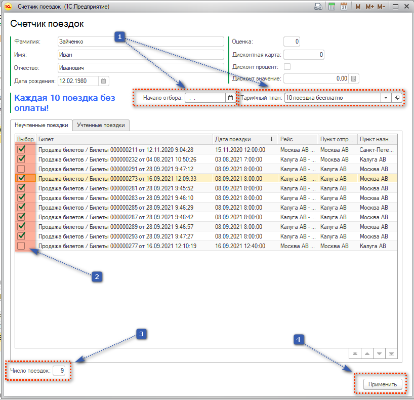 Перед тем как использовать данный функционал в продаже билетов, нужно настроить правила на рейсе, как настроить правила на рейс смотрите инструкцию Создание правила "10 Поездка бесплатно"