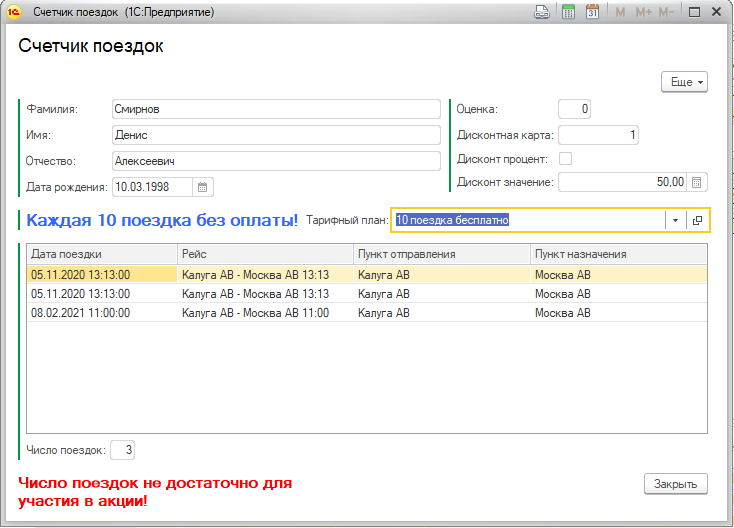 3. Программа сама считает достаточно ли у пассажира поездок или нет. (Если поездок мало, то программа напишет сообщение, смотрите следующий скриншот)