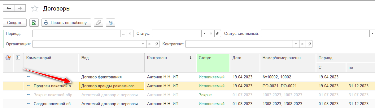 После окончания работы обработки в договоре будет указана новая конечная дата действия и появится комментарий