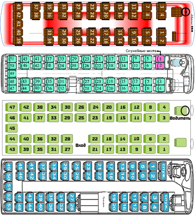 Единого стандарта нумерации мест в автобусах не существует. По результату опроса перевозчиков г. Новосибирска выяснилось, что применяются 6 разных способов нумерации мест в салоне. Даже у одного перевозчика могут быть автобусы с разной системой нумерации. Ниже примеры нумерации, которые мы нашли в интернете и объединили в единый рисунок.