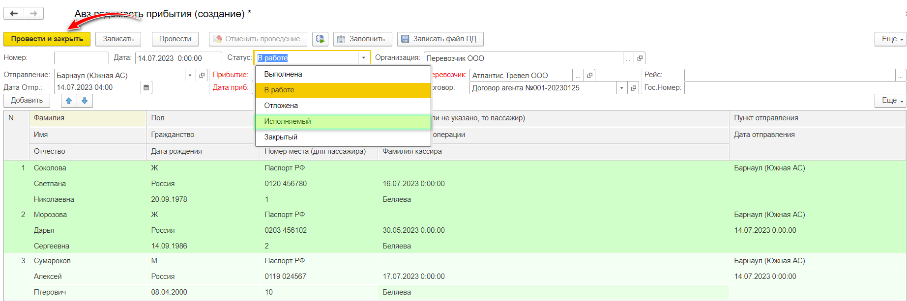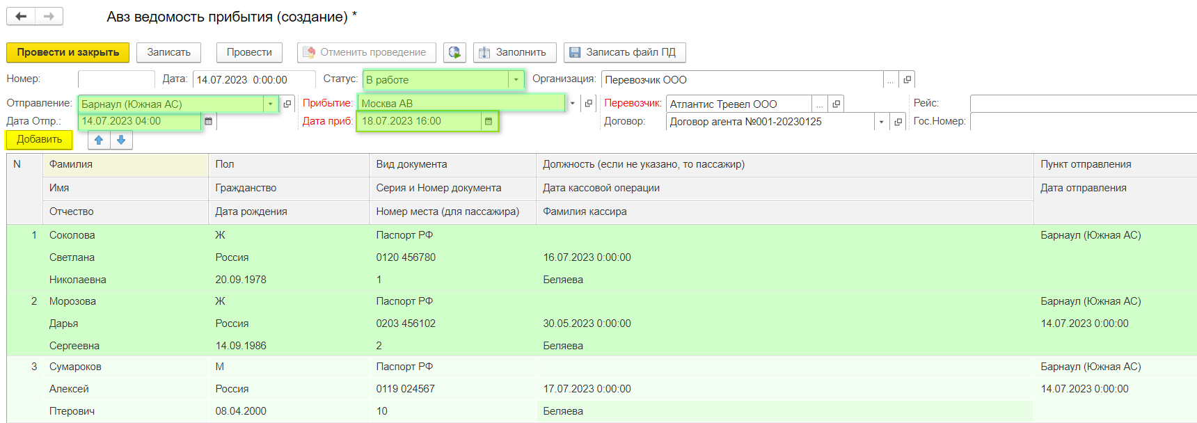Заполняется информация по прибывающим в Москву пассажирам и водителям. Красным выделены поля, обязательные для заполнения. Данные по пассажирам копируются из ведомости. Пол, гражданство, вид документа можно выбрать из выпадающего списка. Для пассажиров указывается номер места, для водителя – должность.