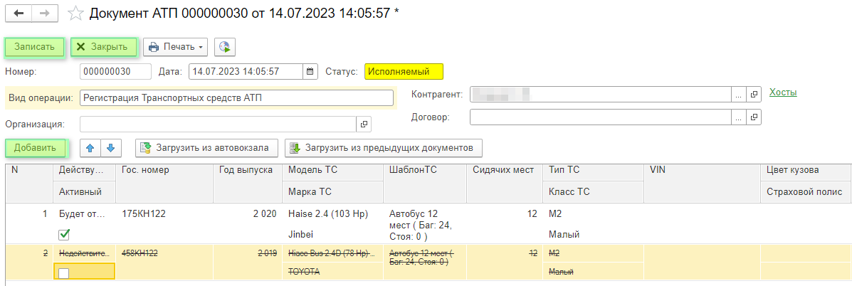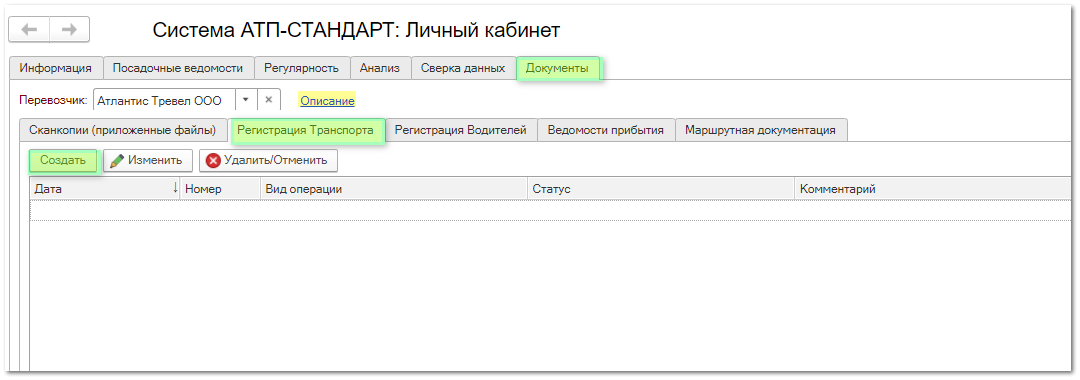 Регистрация транспортных средств производится посредством создания документа (кнопка «Создать»). Пользователь может добавлять удалять и редактировать документы до момента, пока документ не обработан отделом перевозок автовокзала.