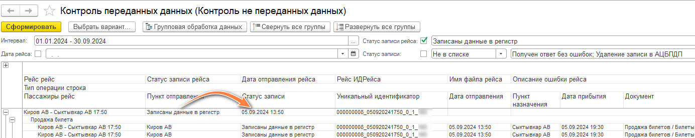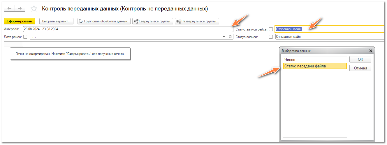 Нажмите в строке "Статус записи рейса" ЛКМ. В диалоговом окне выберите строку "Статус передачи рейса" - Ок.