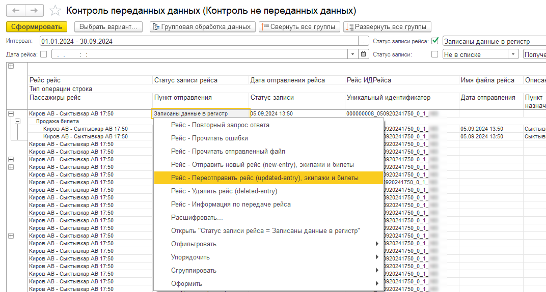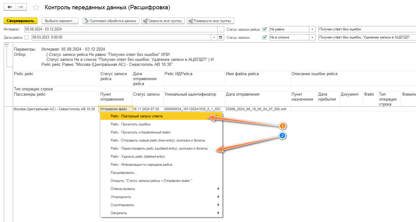 В случае, если такие записи относятся к прошлому периоду, рейс ушел вчера, к примеру, то щелкните по записи ЛКМ - Рейс - Переотправить рейс, экипажи и билеты.