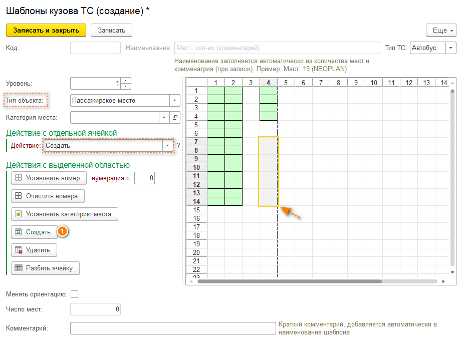 Слева находится табличная часть, в которой выделяется необходимое количество ячеек. Далее выбираем тип объекта "Пассажирское место".