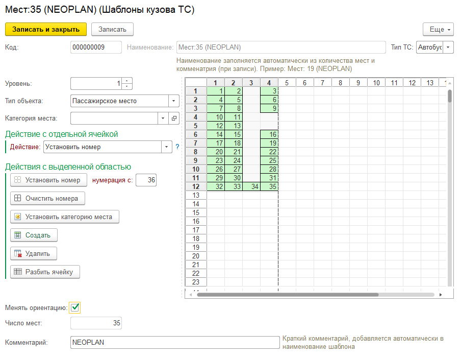 Пример шаблона салона автобуса на 35 мест: