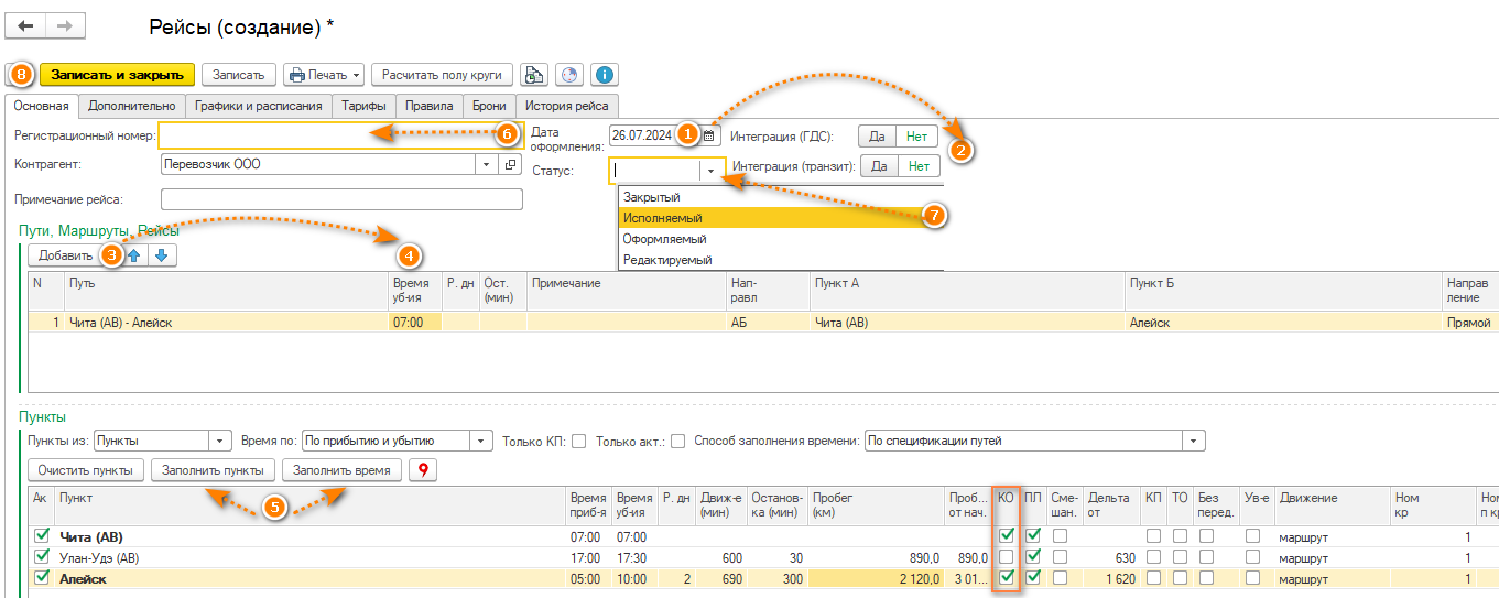 7. Измените статус на «Исполняемый». Будет сформирован рейс с названием по начальному и конечному пунктам и времени убытия из начального пункта.