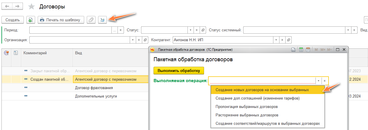 В диалоговом окне выберите операцию "Создание новых договоров на основании выбранных".