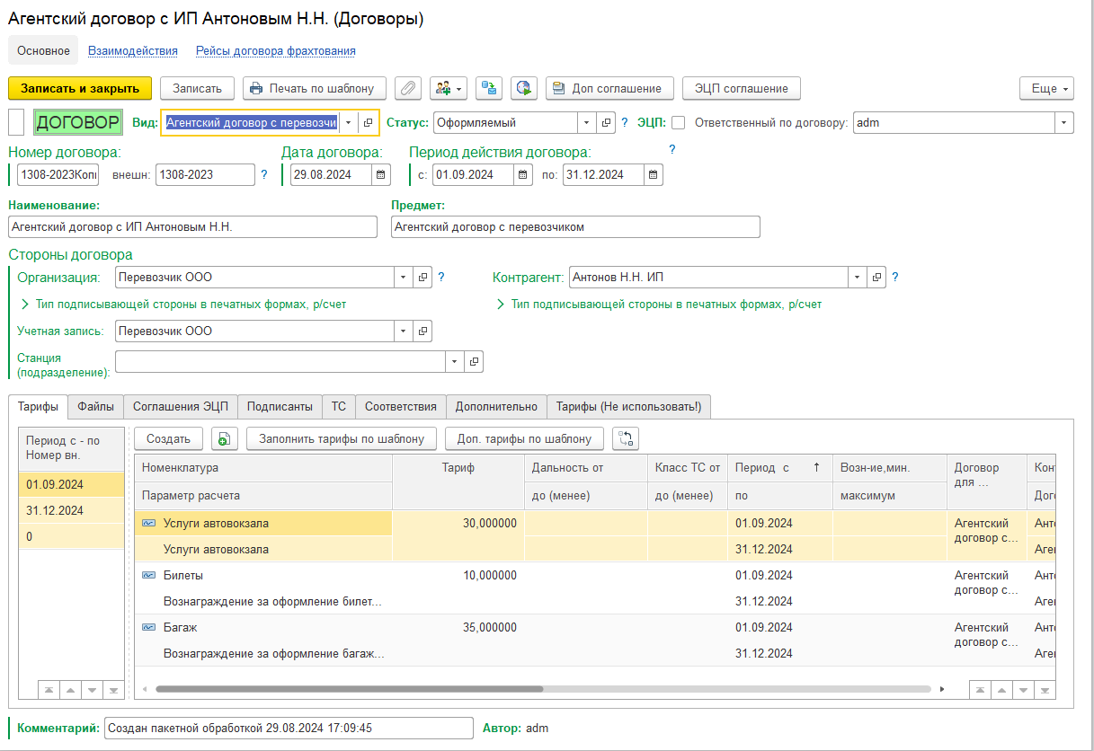 Период действия так же установлен. В табличной части указаны тарифы с привязкой к периоду действия договора. Цены в тарифах можно менять или создавать новые тарифы.