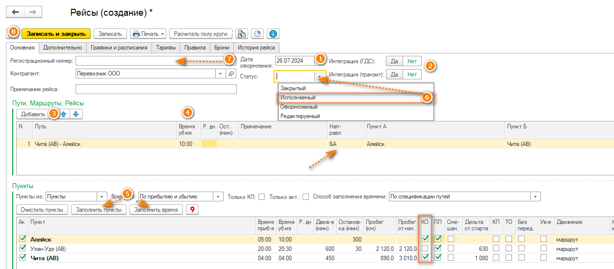 7. Измените статус на «Исполняемый». Будет сформирован рейс с названием по начальному и конечному пунктам и времени убытия из начального пункта.