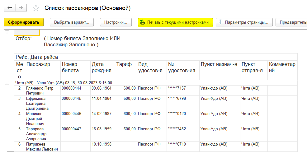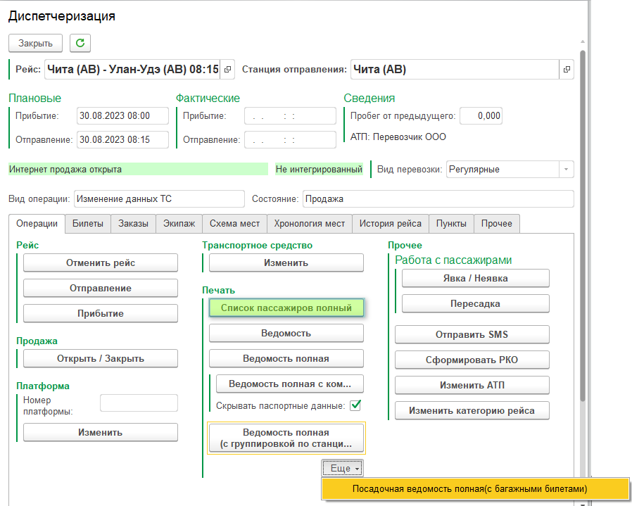 Список пассажиров Чтобы просмотреть или вывести на печать список пассажиров нажмите Список пассажиров полный. Он покажет всех, кто приобрели билеты на данный рейс без учета пункта посадки. Список можно вывести на печать.