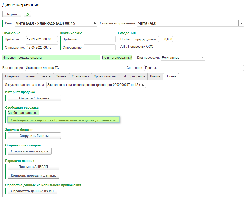 Меню Автостанция - Диспетчеризация - Диспетчеризация - Прочее - Свободная рассадка