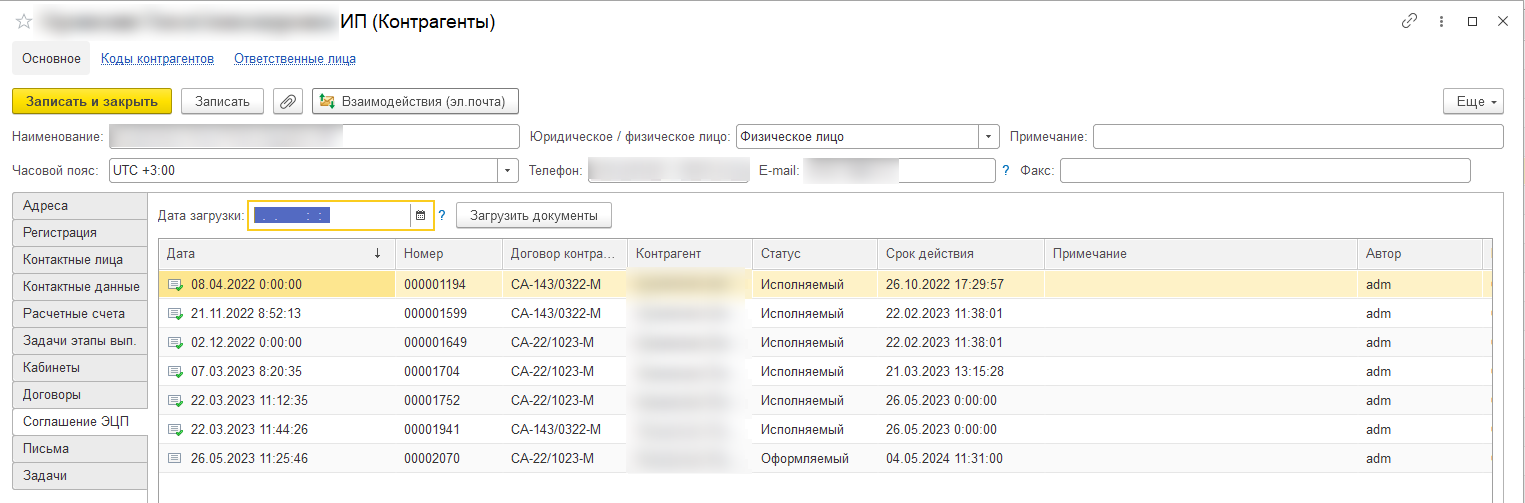 Откройте карточку контрагента. Найдите нужное соглашение, откройте его двойным щелчком ЛКМ.