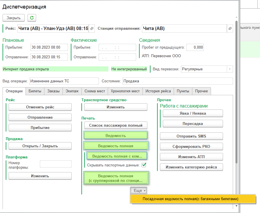 Ведомость полная покажет всех пассажиров, которые едут по данному рейсу, не зависимо от пункта посадки.