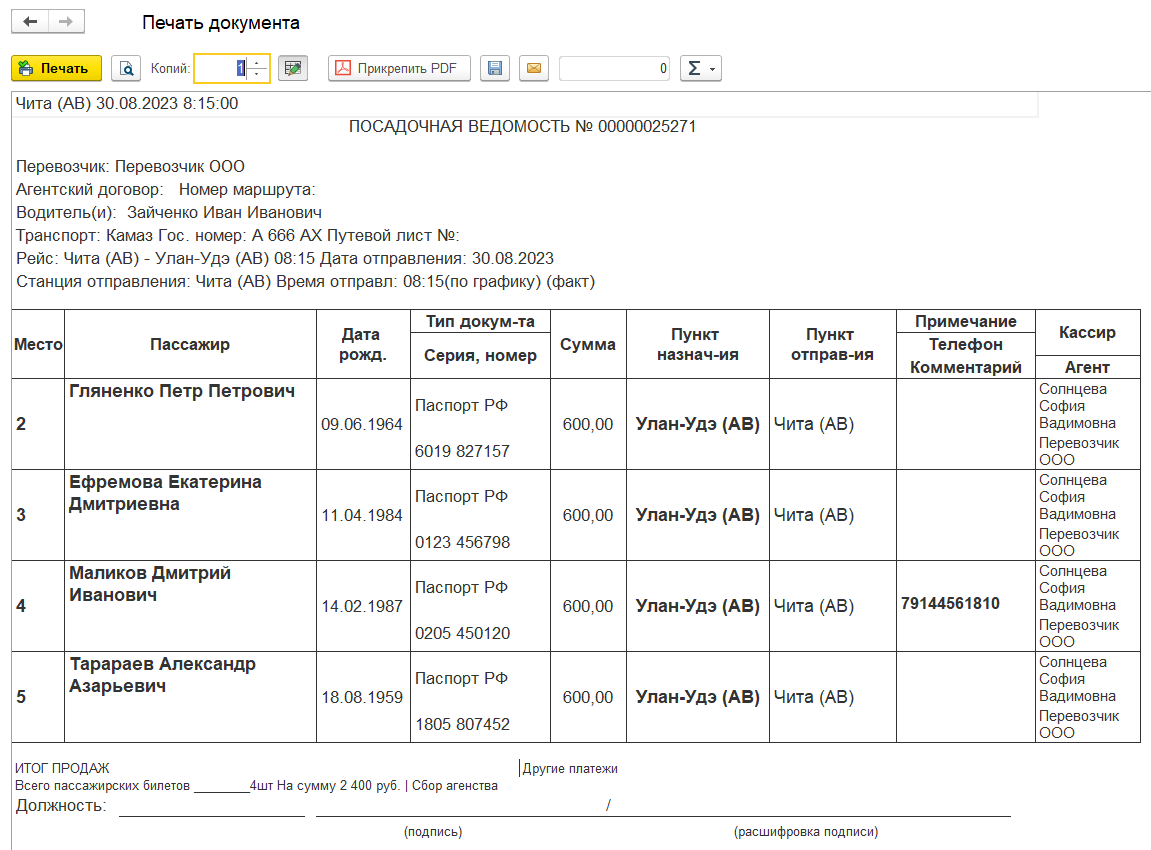 Ведомость полная с комментариями - покажет всех пассажиров, которые едут по данному рейсу, не зависимо от пункта посадки, с комментариями, которые составили кассиры. При желании вы можете установить отметку Скрывать паспортные данные, тогда серия и номер будут закрыты ***.