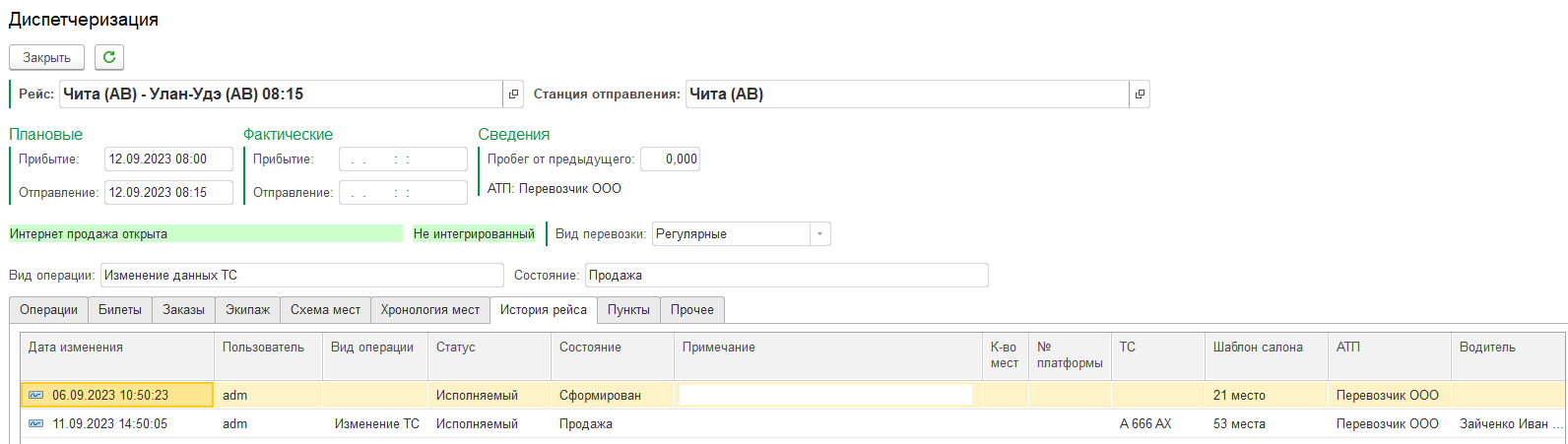Вкладка История рейса Меню Автостанция - Диспетчеризация - Диспетчеризация - История рейса Показывается история событий и изменений связанных с рейсом: смена статусов, экипажа, ТС и т.д.