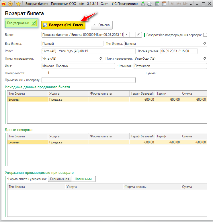 Установите отметку - Без удержаний и нажмите кнопку Возврат.