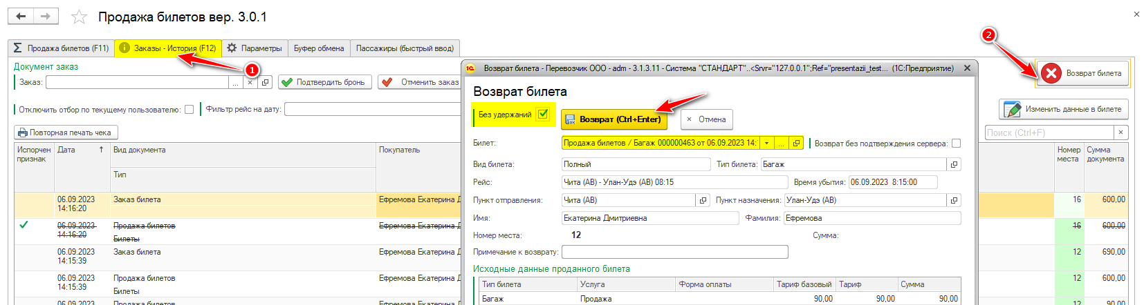 В закладке «Заказы-История» нажимаем на кнопку «Возврат билета».