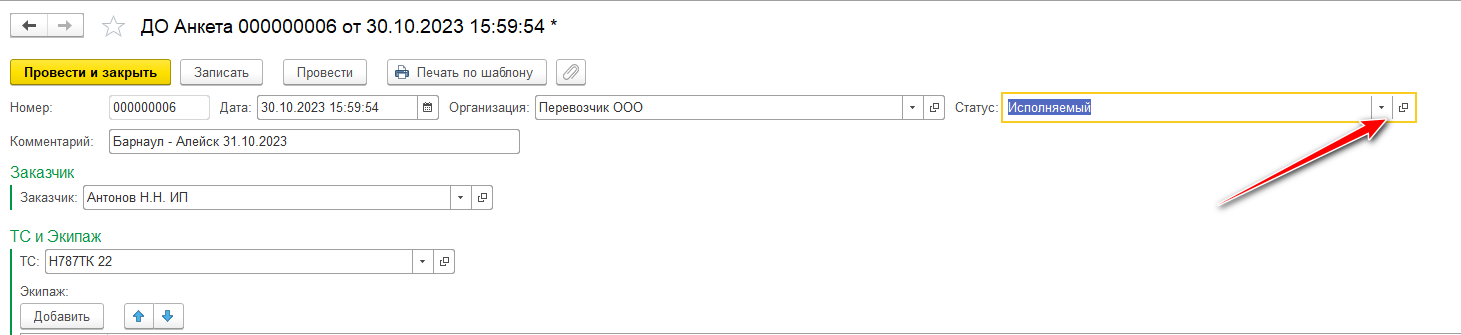 После внесения сведений Проведите документ и установите Статус Исполняемый.