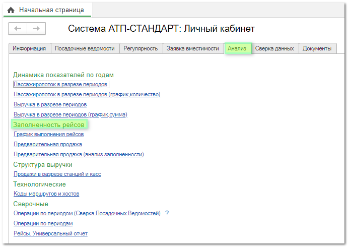 Раздел отчетов "Заполненность рейсов" позволяет нам проанализировать график выполнения рейсов и предварительную продажу в разные периоды времени.